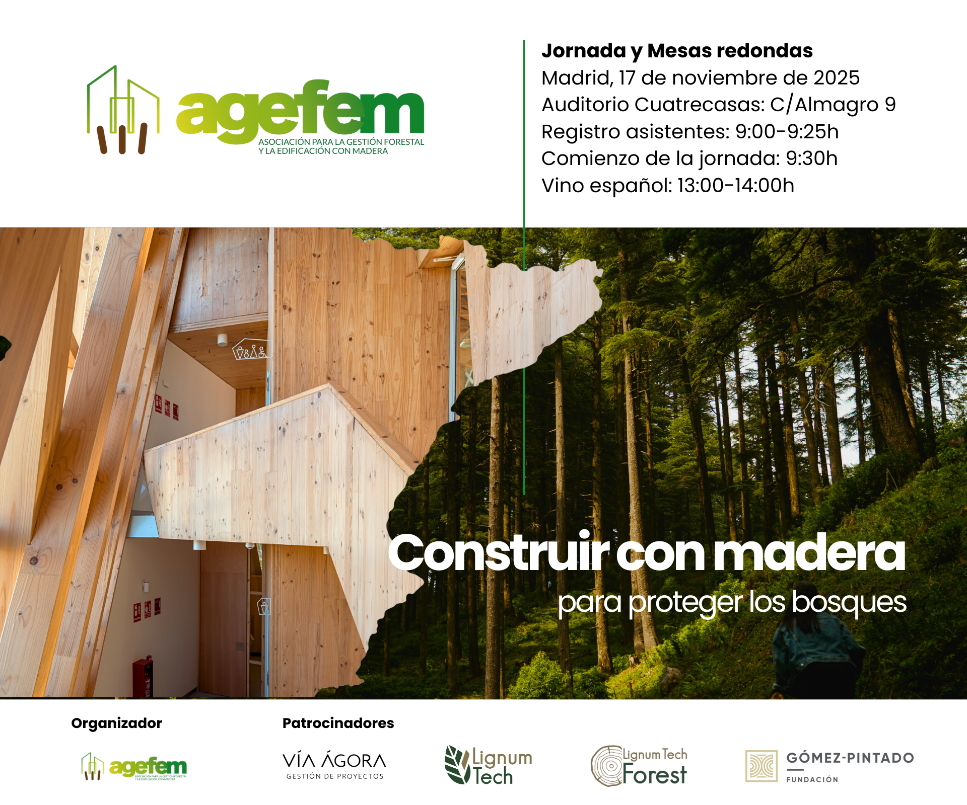 El próximo 17 de noviembre de 2025 se celebra la I Jornada “Construir con madera para proteger los bosques”, punto de encuentro entre el sector forestal y el de la edificación